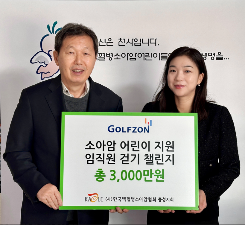 [일요주간 = 김성환 기자] 골프존(각자대표이사 박강수·최덕형)이 18일 (사)한국백혈병소아암협회 충청지회(회장 박우성)에 소아암 투병 어린이들을 위한 기부금과 헌혈증서 전달식을 진행했다고 19일 밝혔다.