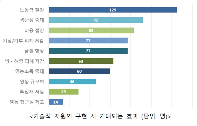 파종·정식 단계에서 인력 수급의 어려움을 해소하기 위해 ‘맞춤형 농기계·작업기’(52명·61.9%) 기술이 지원되기를 희망했다.