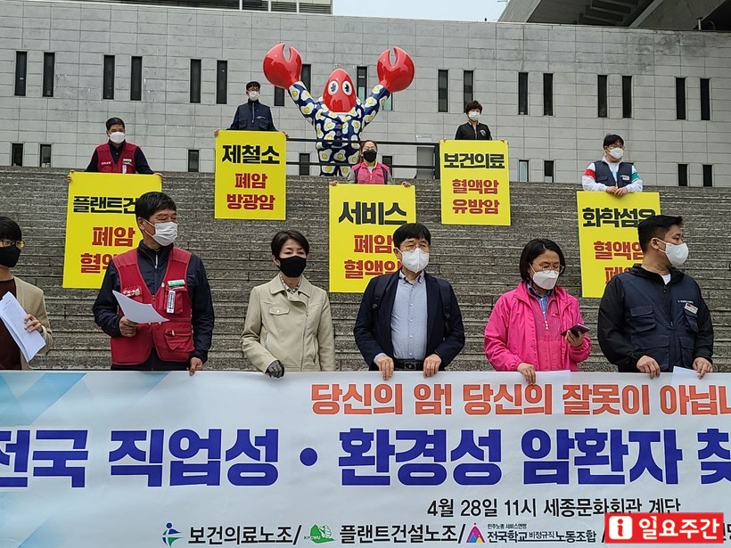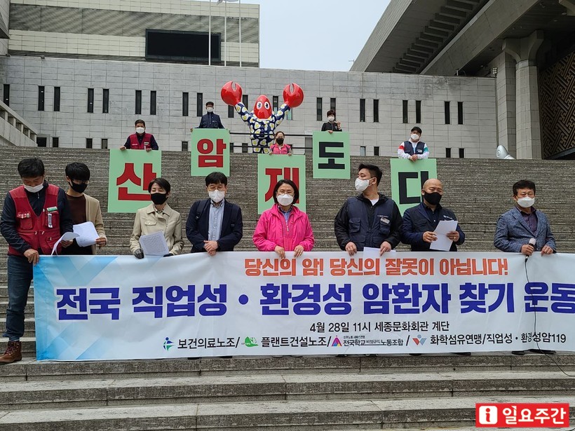 [일요주간 = 이수근 기자] 직업성·환경성 암환자 찾기 119(직업성암119)와 민주노총 산하 보건의료·플랜트건설·학교비정규직·화학섬유 노동자들이 전국 직업성 암을 전수조사하고 산업재해로 인정해달라고 촉구했다.