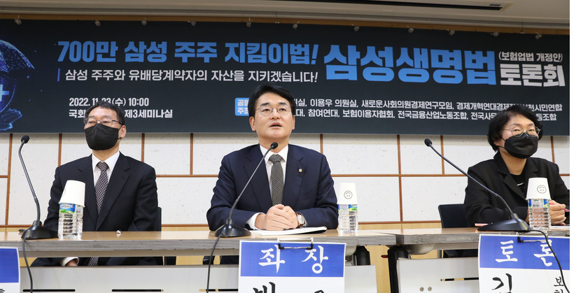 ▲지난해 11월 23일 더불어민주당 박용진 의원(가운데)은 서울 여의도 국회 의원회관에서 열린 700만 삼성 주주 지킴이법! 삼성생명법(보험업법 개정안) 토론회에서 발언하고 있다.(사진=newsis) |