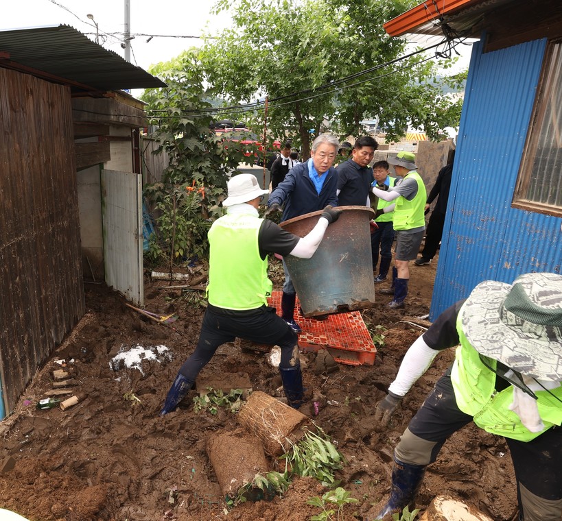 이날 농협 임직원과 자원봉사자 약 100명은 극심한 호우로 막대한 피해를 입은 농가에서 파손된 농자재를 정리하고 침수된 주택과 하우스 복구 작업에 온종일 힘썼다.