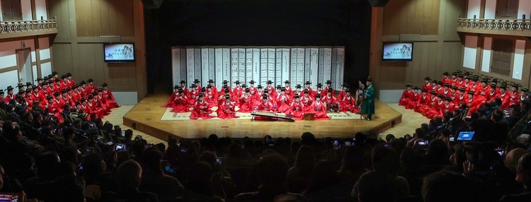 ▲지난 7일 서울 남산국악당 크라운해태홀에서 열린 '제100회 양주풍류악회' 특별 공연에서 양주풍류악회와 국악인 100명이 '수제천' 연주와 구음 공연을 펼치고 있다. (사진 = 크라운해태제과 제공)