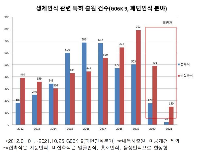 최근 5년간 생체인식 관련 특허출원을 보면 접촉식과 비접촉식 기술을 모두 포함하는 전체 특허출원은 2015년 1031건에서 2019년 1295건으로 25.6% 늘었다.