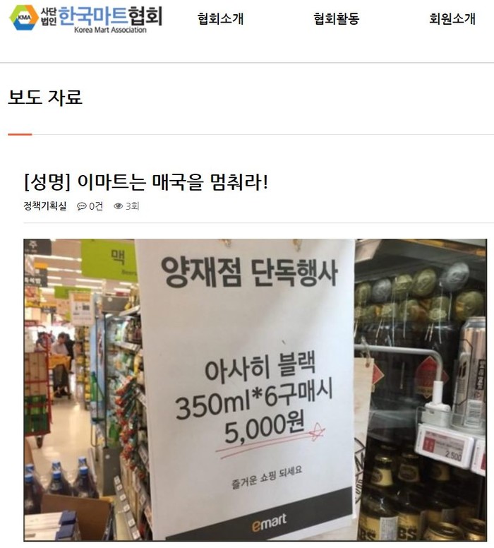이에 (사)한국마트협회(회장 김성민)는 지난 22일 '이마트는 매국을 멈춰라!'라는 제목의 성명서를 통해 "일본 아베정권의 경제보복 조치에 대해 온 국민이 나서서 불매운동에 나서고 있는 요즘, 대표적인 유통대기업 이마트(양재점)가 일본산 맥주 할인행사를 진행하고 있는 것이 확인됐다"면서 "이는 이윤에만 눈이 멀어 쌓여있는 일본산 맥주를 이른바 ‘재고떨이’ 해보겠다는 심보에서 비롯된 매국행위에 다름이 아니다"고 비판했다.