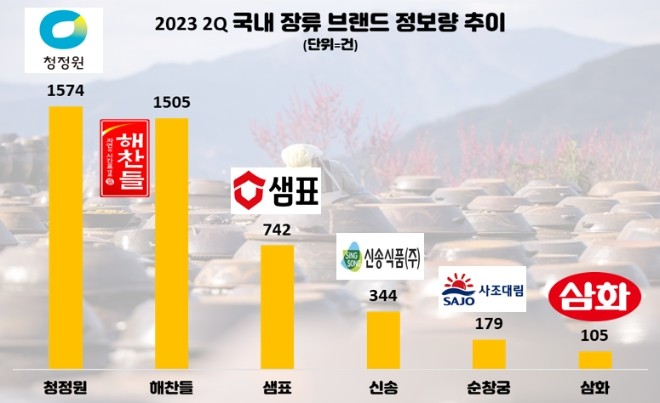 이 조사에서 청정원은 총 1574건의 정보량을 기록하면서 1위에 올랐다. 바로 뒤를 이어 2위에는 해찬들이 1505건이 차지했다. 두 브랜드 간의 정보량 차이는 불과 69건이었다. 뒤이어 샘표가 742건으로 3위, 신송식품이 344건으로 4위, 그리고 사조의 순창궁이 179건으로 5위에 이름을 올렸다.