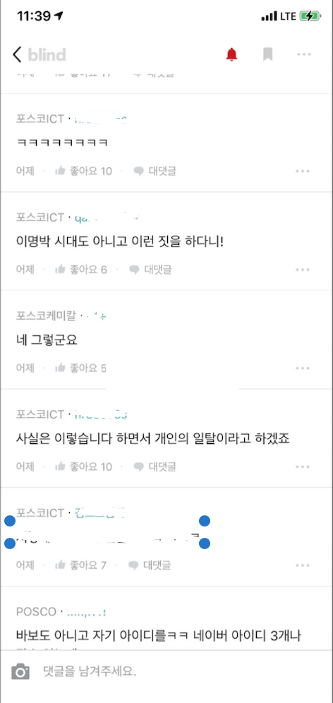 -"사내 구성원들 이용 블라인드 앱에 댓글공작 게시자와 회사 비난하는 글 다수 올라와...현재 삭제 상태"