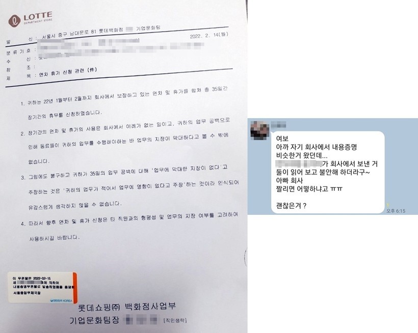▲ 지난 16일 민주노총 서비스연맹 롯데백화점지회 조합원에 롯데백화점 기업문화팀이 등기로 발송한 내용 증명(왼) |
