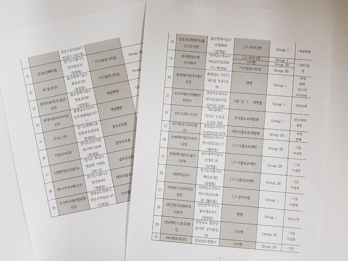 이를 위해 각 사업장에서 실제 대기로 배출하는 특정대기유해물질의 종류를 파악하기 위해 환경부 산하 화학물질안전관리원에서 관리하는 '2016년 화학물질 배출이동량 정보시스템'상의 발암물질 대기배출 통계가 사용됐으며 아울러 각 사업장이 대기배출시설에서 측정하는 특정대기유해물질의 항목을 파악하기 위해 환경부가 작성한 '2016년 1-3종 대기배출사업장 자가측정현황' 자료를 사용했다는 게 이정미 의원 측 설명이다.