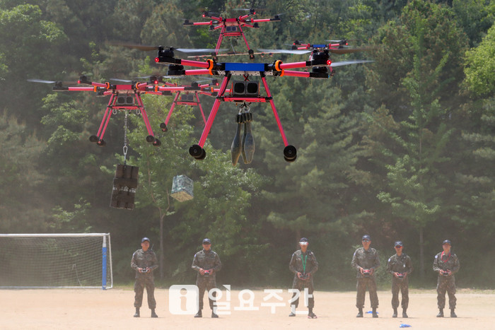 | ▲ 육군정보학교에서 드론 조종사들이 정찰감시와 수송, 타격 등 고급 기술 시연을 하고 있는 장면. |