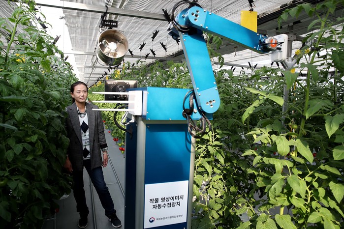 ▲지난해 11월 전북 전주시 농촌진흥청 농업공학부 스마트온실에서 열린 '한국형 스마트팜 2세대 기술' 시연회에서 작물 영상이미지 자동수집장치로 시연을 하고 있는 모습.(사진=농촌진흥청 제공) |