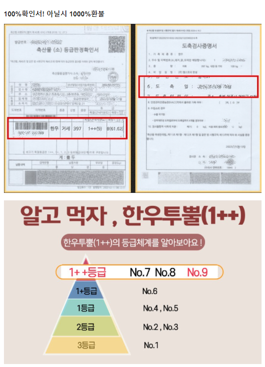 ▲온라인 커뮤니티에서 쇠고기를 판매하는 B업체 사이트에는 자신이 판매하는 고기가 1++ 등급을 받은 것이란 확인서 등이 게재되어 있다. <사진=해당 사이트 캡쳐> |