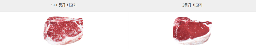 ▲쇠고기 등급 비교 사진. 육안으로도 구분 가능하다. <사진=축산물품질평가원 홈페이지> |