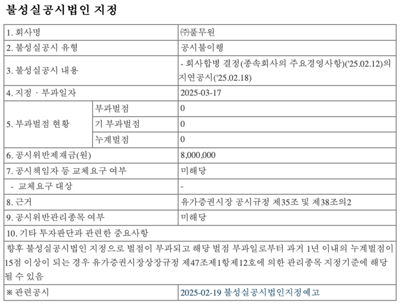 ◇ 불성실공시법인 지정, 제재금 800만 원 부과됐고 브랜드 이미지 타격 예상