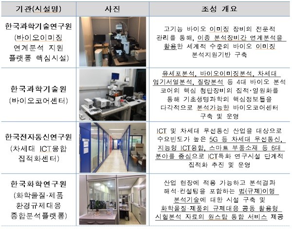 공고를 통해 최종적으로 한국전자통신연구원(차세대 ICT융합집적화센터), 한국과학기술원(바이오코어센터), 한국과학기술연구원(바이오이미징 연계분석 지원 플랫폼 핵심시설), 한국화학연구원(화학물질·제품 환경규제대응 종합분석플랫폼)의 총 4개 시설이 선정됐다.