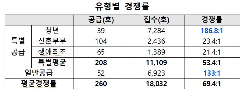 특별공급은 총 208세대 공급에 1만1,109명이 신청해 53대1을 기록했다. 유형별로는 청년특별공급(187대1)이 최고 경쟁률을 기록했으며, 신혼부부특별공급(23대1), 생애최초특별공급(21대1) 순으로 높았다.
