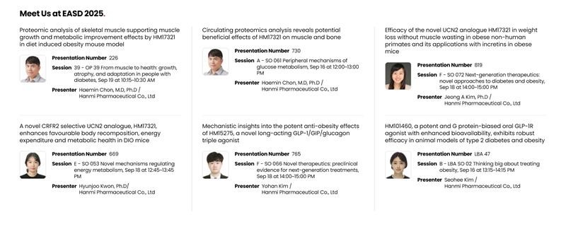 이번 학회에서는 삼중작용 비만치료제(HM15275), 신개념 비만치료제(HM17321), 경구용 비만치료제(HM101460) 등 주요 후보물질이 소개된다. 한 건은 구연 발표로 진행된다.