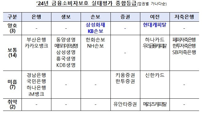 소비자보호 관련 기관제재, 불완전판매 등으로 사회적 물의를 야기한 9개사는 종합등급이 1단계 하향조정돼 7개사(경남은행, 국민은행, 하나은행, iM뱅크, 키움증권, 한투증권, 신한카드)가 ‘미흡’, 2개사(유안타증권, 메리츠캐피탈)가 ‘취약’으로 평가됐다.
