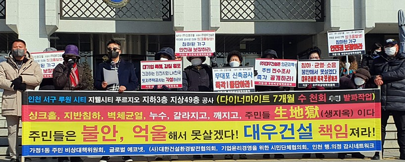 가정1동 주민 비상대책위원회, 인천 행·의정 감시네트워크 등은 지난 18일 인천시청 앞에서 기자회견을 열고 인천 서구 루원 시티 지웰 푸르지오 아파트의 시공사인 대우건설을 규탄했다. 토목공사 중 과도한 발파 작업으로 싱크홀, 지반침하, 균열, 누수 등으로 피해가 심각함에도 보수작업과 보상 절차 마련이 이뤄지지 않았다는 주장이다.