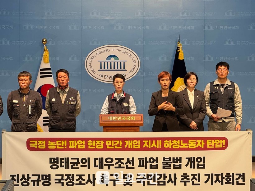▲ 지난 19일 국회에서 열린 전국금속노동조합 '명태균의 대우조선 파업 불법 개입 진상규명 국정조사 촉구 및 국민감사 추진' 기자회견. (사진=금속노조 제공)