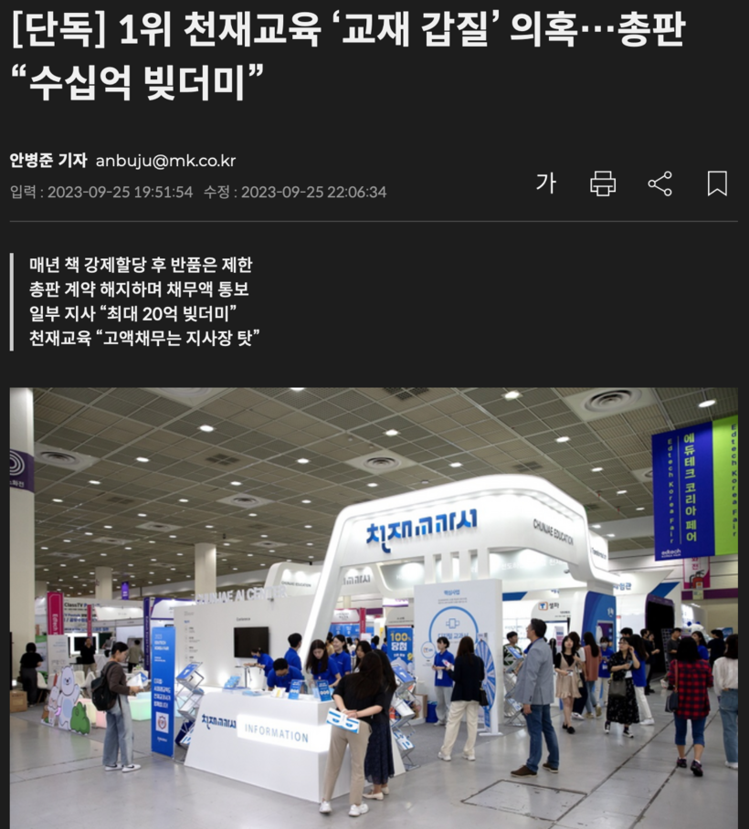 ▲ 지난 달 25일 천재교육의 대리점, 중소서점 대상 물량 밀어내기 등 의혹을 보도한 매일경제 기사 캡쳐. |
