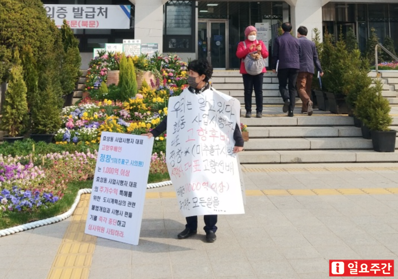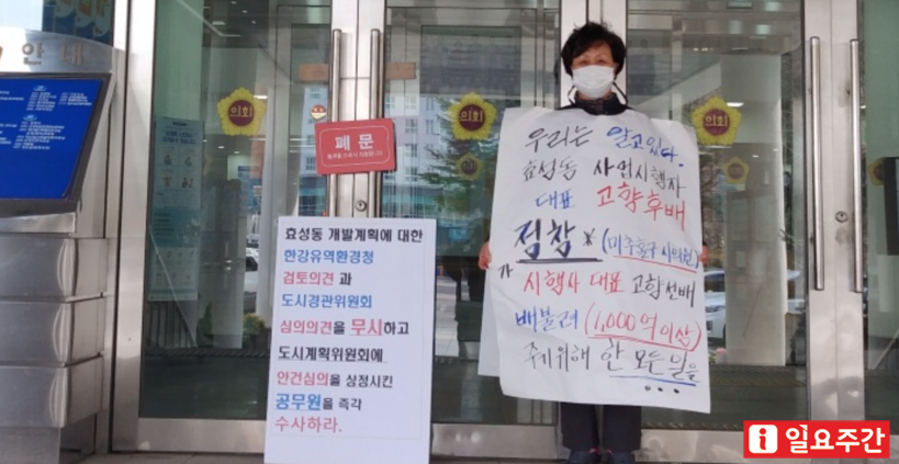▲효성지구비상대책위원회는 지난 4일부터 인천시청 앞에서 효성도시개발사업 특혜 및 로비 의혹관 관련해 수사를 촉구하며 1인 시위를 벌이고 있다.