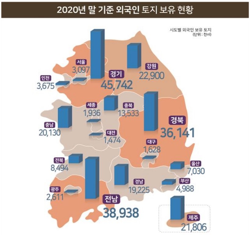 [일요주간 = 이수근 기자] 지난해 말 외국인 보유 토지가 253.3㎢로 전 국토의 0.25%에 달한 것으로 나타났다.