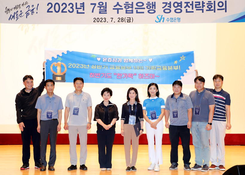 ▲ 수협은행은 지난 28일, 인천 옹진군 영흥도 영흥에너지파크에서 상반기 성과와 하반기 경영목표 등을 공유하는 ‘2023년 하반기 수협은행 경영전략회의’를 개최했다. 사진은 강신숙 은행장(왼쪽 네 번째)이 상반기 수도권지역 금융본부 1위를 차지한 서울가락금융본부(본부장 윤효심, 왼쪽 다섯 번째)와 본부 산하 영업점장들과 기념촬영을 하는 모습.(사진=Sh수협은행) |