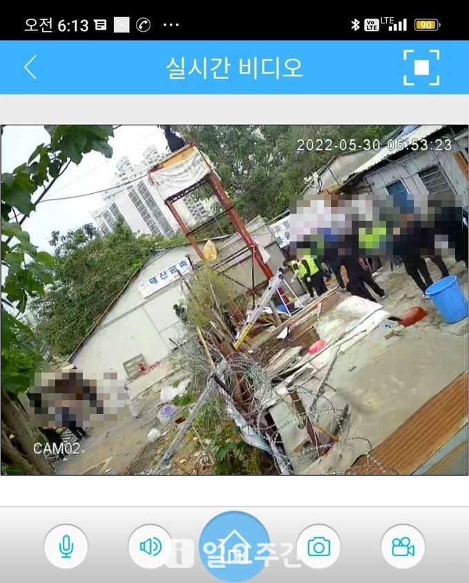 ▲민영옥 씨 집에 설치된 CCTV를 통해 촬영(5월 30일)된 철거 강제집행 모습이다. 집행 과정에서 CCTV 셋톱박스가 통째로 없어졌다. 해당 CCTV 셋톱박스에는 철거 집행 당시 모든 과정이 고스란히 녹화되어 있는데, 집행 과정에서 누군가가 증거인멸을 위해 가져갔다며 민영옥 씨 측은 경찰에 고소장을 제출했다. |