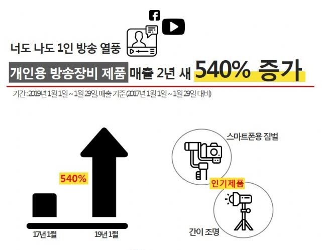 8일 전자상거래업체인 인터파크에 따르면 지난 1월 1일부터 29일까지 약 1달간의 개인용 방송 장비 카테고리 매출을 분석한 결과 작년 같은 기간에 비해 130% 가량 매출이 증가했다. 또 2017년에 비해서는 무려 540% 늘었다.