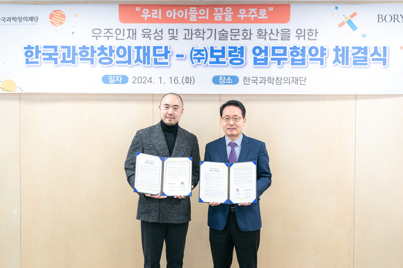 [일요주간 = 하수은 기자] 헬스케어기업 (주)보령(구 보령제약, 이하 보령)은 지난 16일 한국과학창의재단(이하 창의재단)과 청소년 우주인재를 육성하고 과학기술문화를 확산하기 위한 업무협약을 체결했다고 17일 밝혔다.