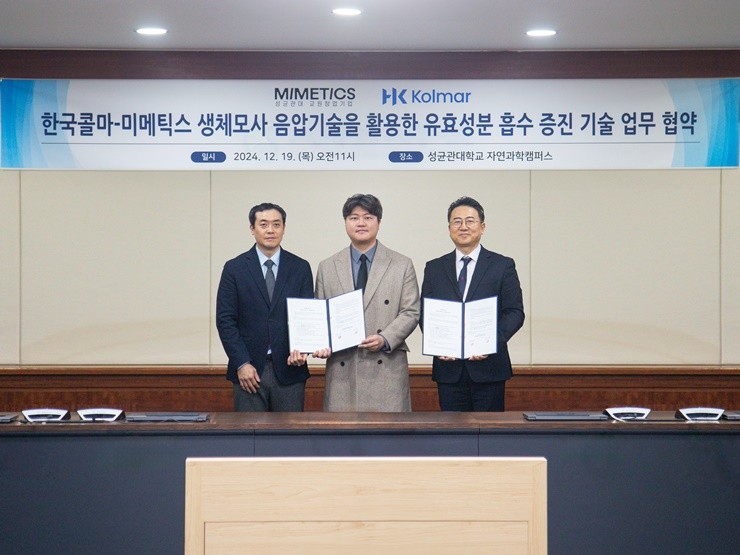 이날 협약식에는 한상근 한국콜마 기술연구원 부원장과 미메틱스 박형기 대표, 성균관대학교 방창현 교수 겸 미메틱스 CTO등이 참석했다.