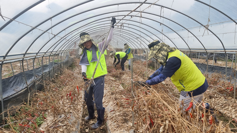 이날 농협금융 리스크관리부문 임직원들은 무더위 속에서도 수해로 침수된 농가를 방문하여 고추 농장 비닐하우스 철거와 고추대 제거 등 수해복구 작업을 지원했다.