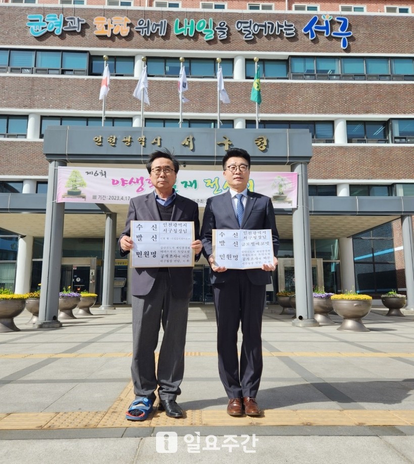 ▲12일 글로벌 에코넷, 인천 행·의정 감시네트워크, 인천 서구단체 총연합회는 인천 서구의회에 제일풍경채 공동주택부지 토양오염과 관련 공개조사를 촉구하는 진정서와 함께 강범석 서구청장 공개 면담서를 접수했다.(사진=일요주간 DB)