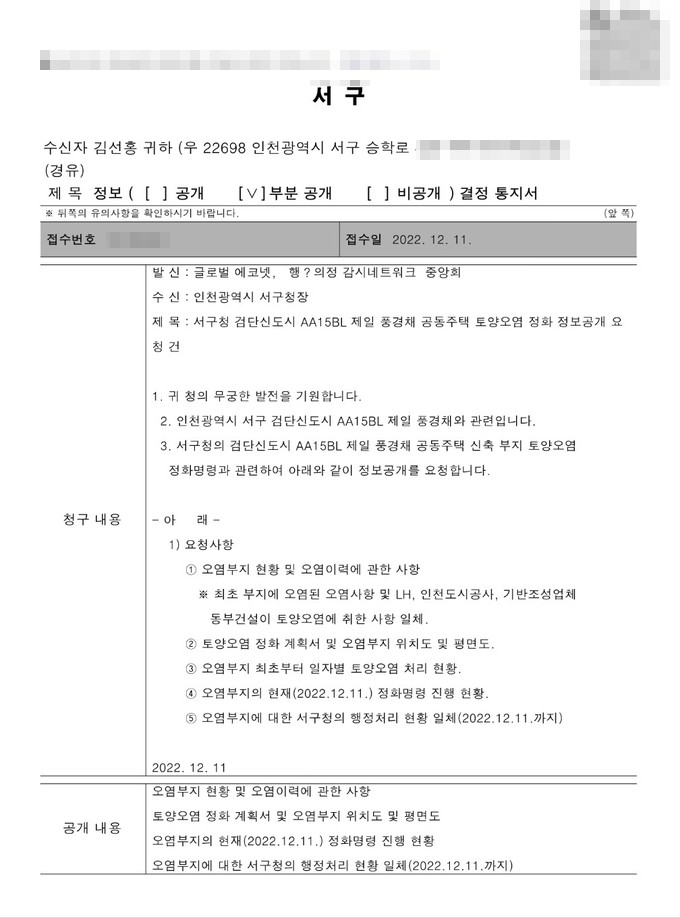 13일 글로벌 에코넷에 따르면 검단신도시 아파트 신축부지 토양오염과 관련 지난해 11월 11일 서구청에 구두 요청한 추가자료에 대해 12월 11일 정보공개를 요청했고 서구청은 정보공개 요청과 관련해 올해 1월 6일까지 답변을 연장했다. 이 단체는 또다시 1월 6일 국민신문고를 통해 정보공개를 요청했고 서구청은 1월 18일 공개된 답변에서 “토양오염 정화 명령 핵심사항인 ‘오염부지 최초부터 일자별 토양오염 처리현황’이 ‘기업의 영업비밀에 해당한다는 비공개 결정’을 내렸다”고 밝혔다.