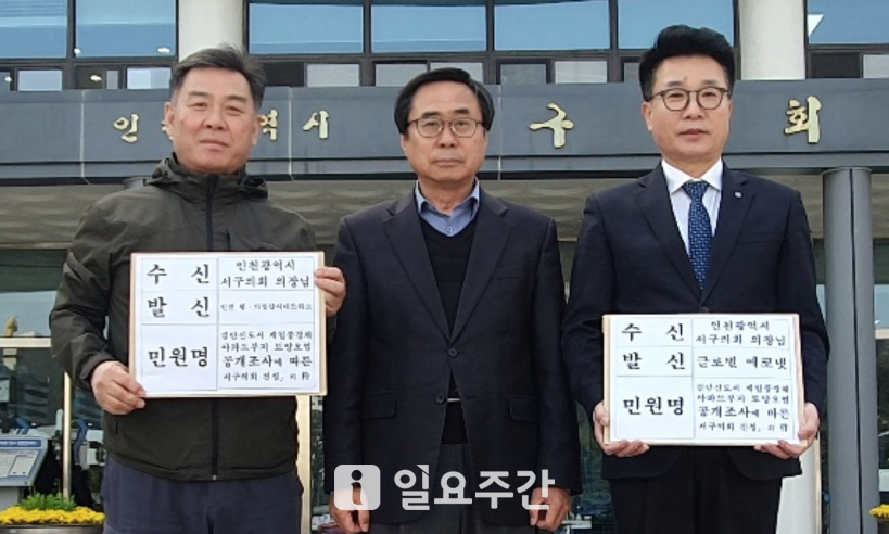 이런 가운데 글로벌 에코넷, 인천 행·의정 감시네트워크, 인천 서구단체 총연합회는 12일 오후 인천 서구청 앞에서 기자회견을 열고 인천 서구의회에 제일풍경채 공동주택부지 토양오염 정화와 관련해 공개조사를 촉구하는 진정서와 함께 강범석 서구청장 공개 면담서를 접수했다.