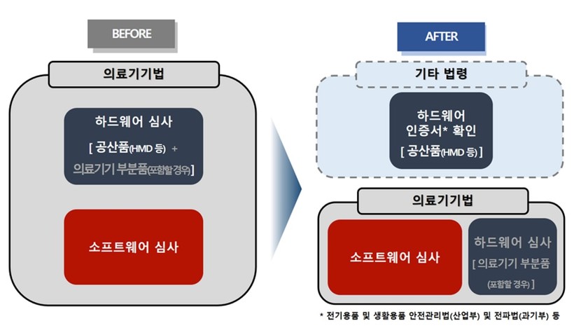전기를 사용하는 의료기기는 전기·전자파 안전에 관한 자료를 의무적으로 제출해야 했으나 VR·AR 소프트웨어가 헤드 마운트 디스플레이(HMD)와 모바일기기 등 공산품에 사용되면 공산품은 다른 법령에 따라 발급된 안전 인증서 유무만 확인하고 의료기기에 해당하는 소프트웨어만 심사하도록 개선한다.