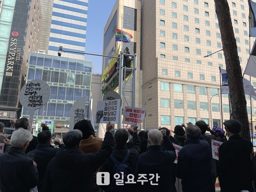 15년째 세종호텔 정리해고 노동자들의 '복직' 외침···10미터 높이서 고동농성 돌입