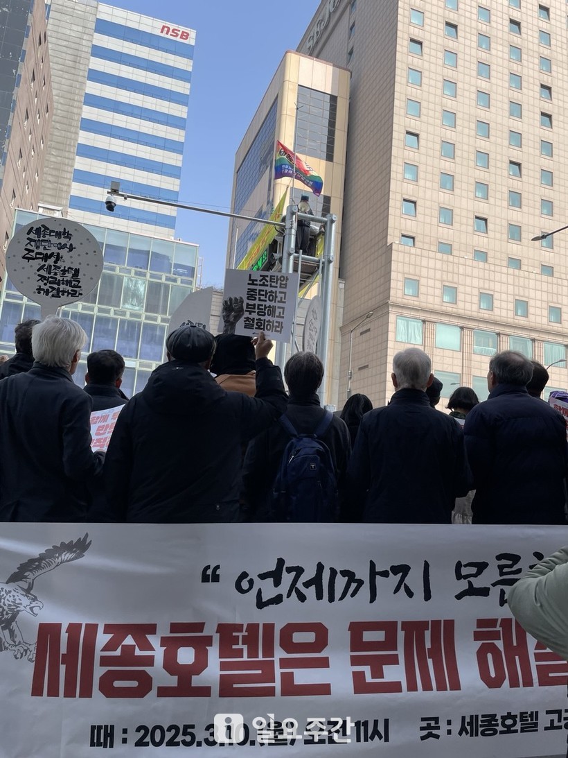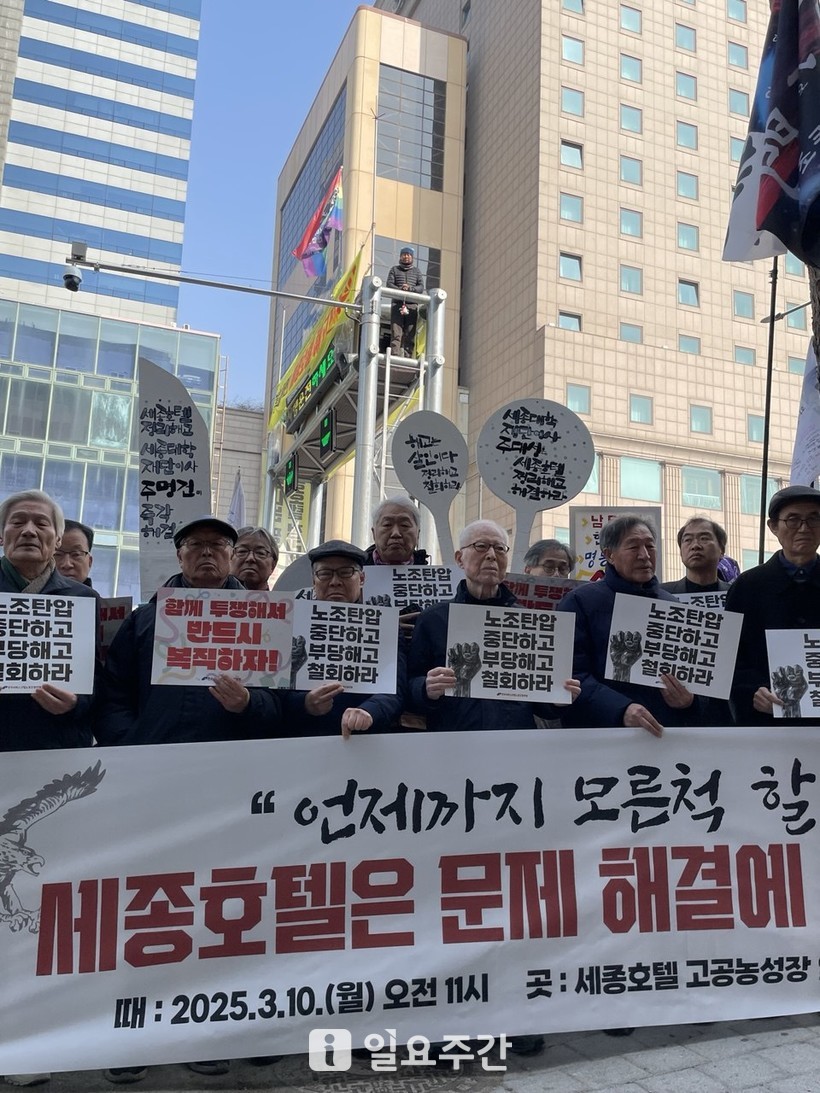 [일요주간=임태경 기자] 15년째 세종호텔(세종대학교 재단인 대양학원이 100% 지분 소유)의 정리 해고에 맞서 복직 투쟁을 벌이고 있는 노동자가 한 달 가까이 고공농성을 벌이고 있다.