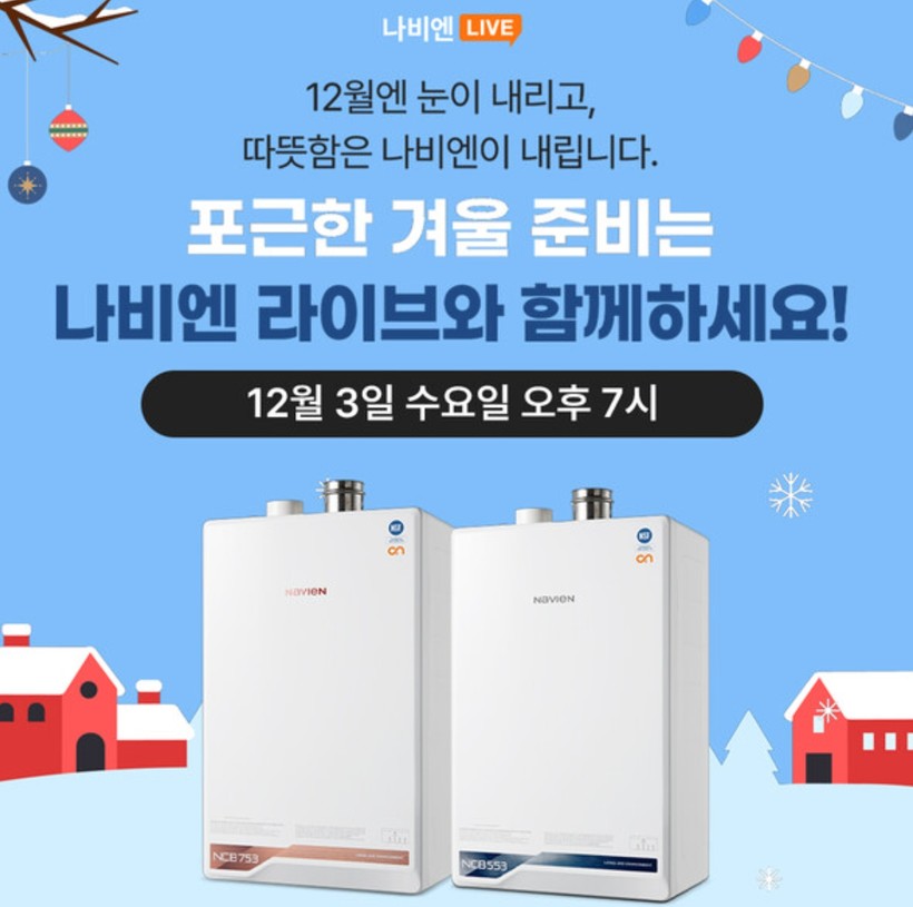 방송에서 소개되는 제품은 빠른 온수 공급이 강점인 ‘나비엔 콘덴싱 ON AI’ 시리즈의 ‘NCB753’과 ‘NCB553’ 모델이다. 두 제품 모두 온수레디 시스템을 적용해 기존 보일러 대비 약 93% 단축된 10초 이내로 온수를 사용할 수 있는 것이 특징이다. 라이브 방송을 통해 구독을 신청하면 특별 할인가가 적용되며, ‘NCB753’은 제휴카드 조건 충족 시 월 1만900원, ‘NCB553’은 월 7900원 수준으로 이용이 가능하다.