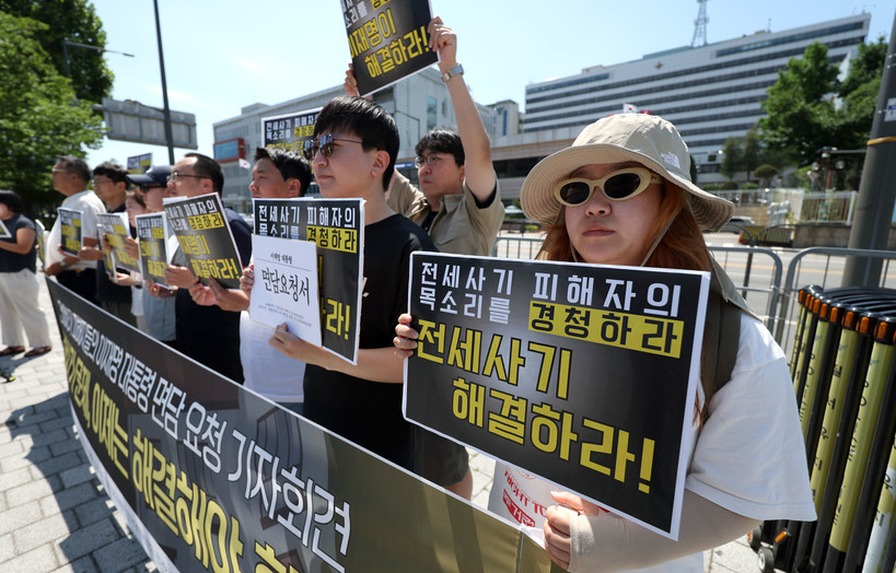 | ▲ 전세사기·깡통전세 피해자들이 지난 10일 서울 용산구 대통령집무실 앞에서 기자회견을 열고 전세사기 피해구제를 위한 전세사기 특별법 개정, 전세사기·깡통전세 예방 대책 강화 및 제도개선, 전세사기 가해자 엄중 처벌, 전세사기 문제해결을 위한 협의체 마련 등 촉구했다. (사진=newsis) |