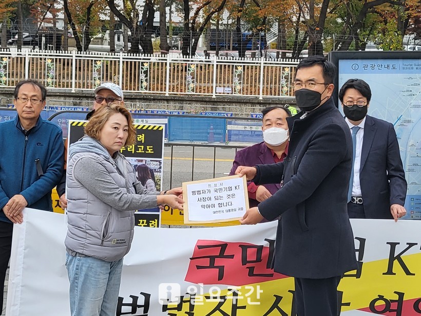 | ▲kt새노조와 시민단체 약탈경제반대행동은 3일 서울 용산 태통령실 앞에서 구현모 kt 사장의 연임을 반대하는 기자회견을 열고 대통령실에 진정서를 전달했다.(사진=kt새노조) |