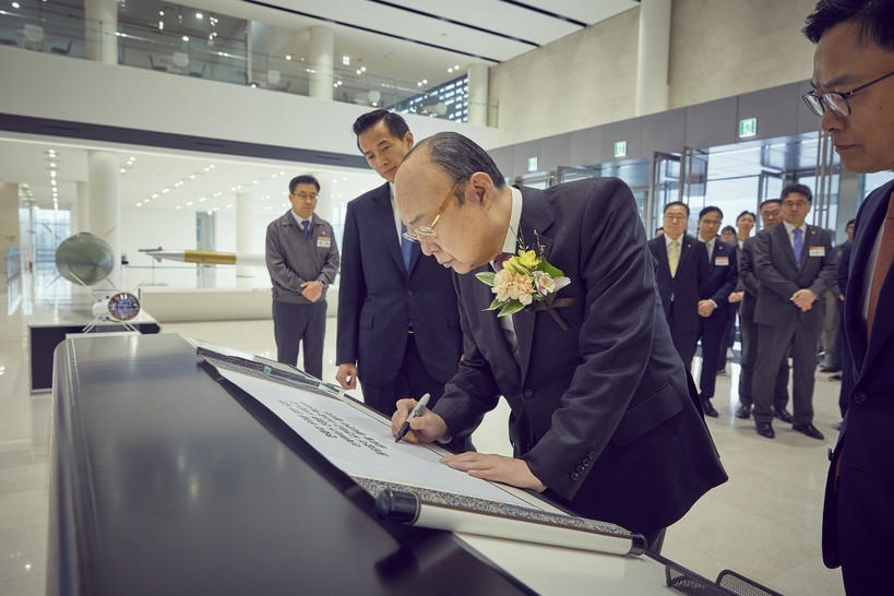 ▲ 한화그룹 김승연 회장이 한화에어로스페이스 대전 R&D 캠퍼스에 방문해 기념 방명록을 작성하고 있다.(사진=한화그룹 제공) |