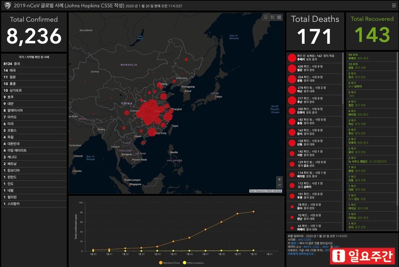 | ▲ 존스홉킨스대 신종 코로나 바이러스 실시간 글로벌 현황 확인 사이트 (이미지 편집=일요주간) |