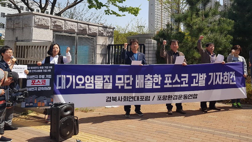 | ▲ 2019년 포스코 고로에서 지난 수십 년 동안 고로 정비 중 휴풍과 재송풍 작업 시에 브리더라는 압력밸브를 통해 대기오염물질이 무단배출 되어 온 사실이 드러났다. 포항환경운동연합과 경북사회연대포럼은 이에 대해 대기환경보전법 위반혐의로 포스코를 고발했다. 사진은 당시 기자회견 장면이다. |
