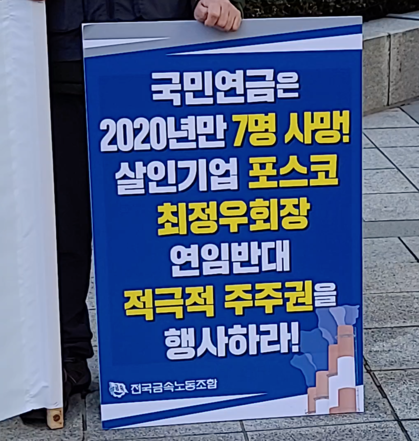 이어 "이들 지부와 지회는 12일 포스코 정기 주총을 앞두고 3일부터 포항제철소 앞 천막·단식 농성, 3일 국회 토론회, 4일 최정우 산업안전보건법 위반 검찰 고발, 12일 주총 대응 상경투쟁 등 총력투쟁을 벌이고 있다"며 "각 지부와 지회는 포스코 본사 앞 1인 시위 등을 전개하고 있다"고 밝혔다.