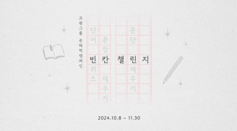 교원그룹이 마련한 ‘빈칸 챌린지’는 단어 퀴즈, 문장 채우기, 문단 채우기 등을 통해 자연스럽게 문해력을 키울 수 있도록 돕는 캠페인이다. 교원그룹 SNS 채널에 게시된 ‘빈칸 챌린지’ 링크를 통해 참여할 수 있다.