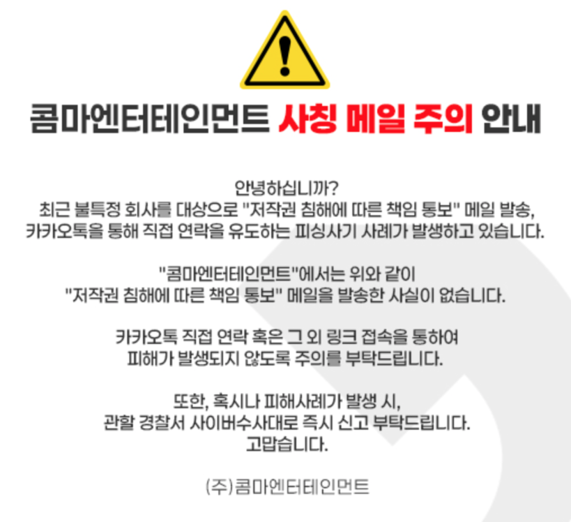 ㈜콤마엔터테인먼트는 8일, 공식 입장문을 통해 “최근 불특정 회사를 대상으로 자사를 사칭한 피싱 메일이 무차별적으로 발송되고 있다”며 “해당 메일은 ‘저작권 침해에 따른 책임 통보’라는 제목으로 발송되며, 카카오톡을 통한 1:1 연락을 유도해 피해를 입히는 수법”이라고 밝혔다.