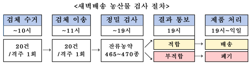 식약처는 이번에 실시하는 새벽배송 농산물 검사는 수거부터 결과 통보까지 당일에 이루어지도록 검사체계를 구축해 새벽배송 농산물을 소비자가 안심하고 소비할 수 있도록 했다.