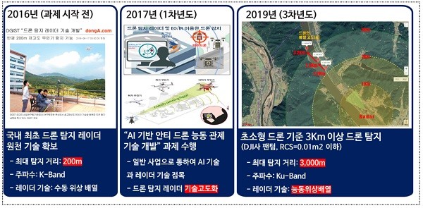 DGIST 연구팀은 2016년 국내 최초로 200m 이상 탐지 가능한 레이더 시스템을 자체 개발했다. 그리고 이번에는 순수 국내 기술로 3km 이상 떨어져 비행하는 초소형 팬텀 드론(55cmx55cmx40cm)을 알아차리는 ‘드론 탐지 레이더 시스템’을 개발했다.