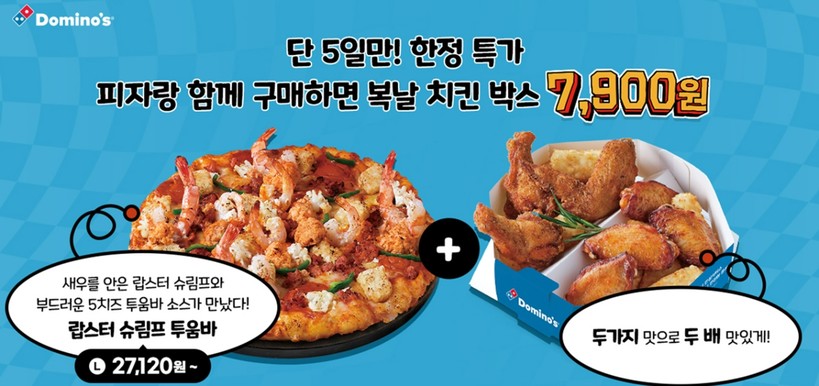 ‘복날 치킨 박스’는 중복인 이달 30일부터 8월 3일까지, 그리고 말복인 8월 6일부터 10일까지 피자 한 판당 1회에 한해 주문할 수 있다. 도미노피자는 신제품 ‘랍스터 슈림프 투움바 피자’가 블랙타이거 슈림프, 꼬리 알새우, 랍스터, 버터 스퀴드 등 풍부한 해산물과 카망베르, 파마산, 체더, 로마노 치즈와 투움바 크림 치즈 소스가 결합된 '투움바 파이브 치즈 소스'로 특별한 맛을 선사한다고 설명했다.